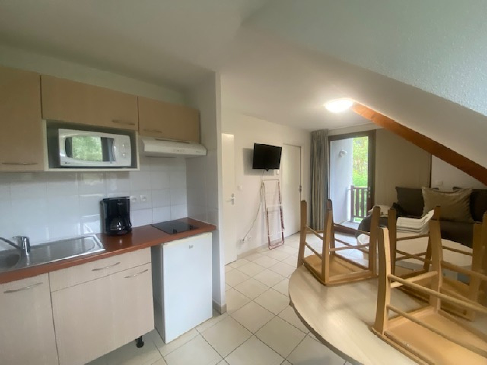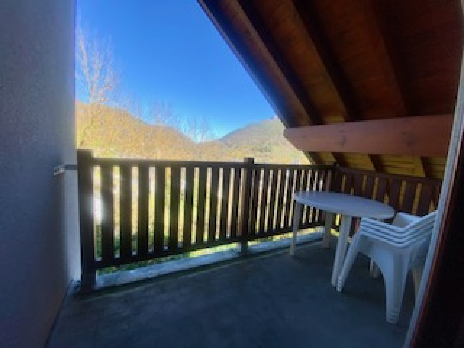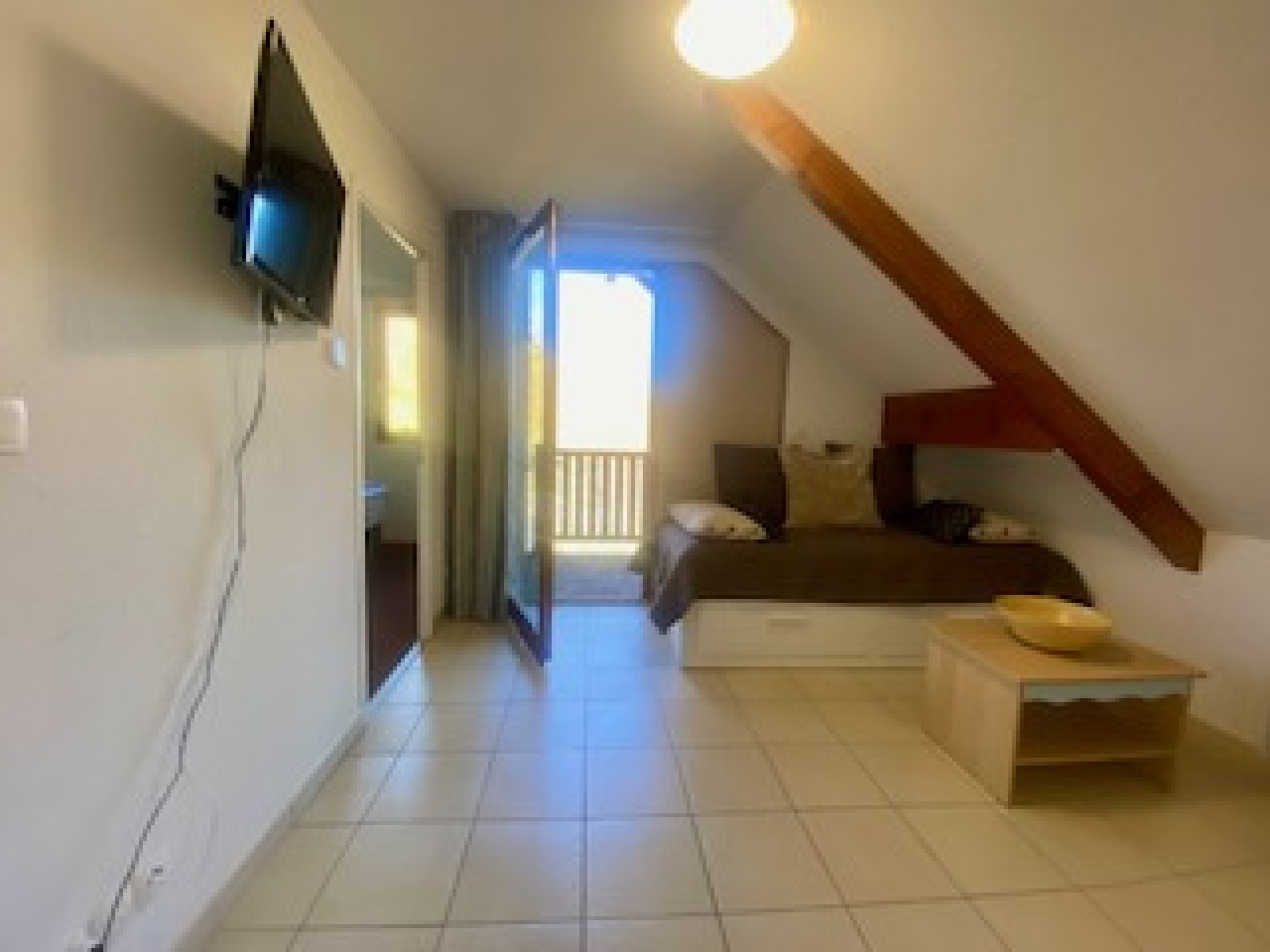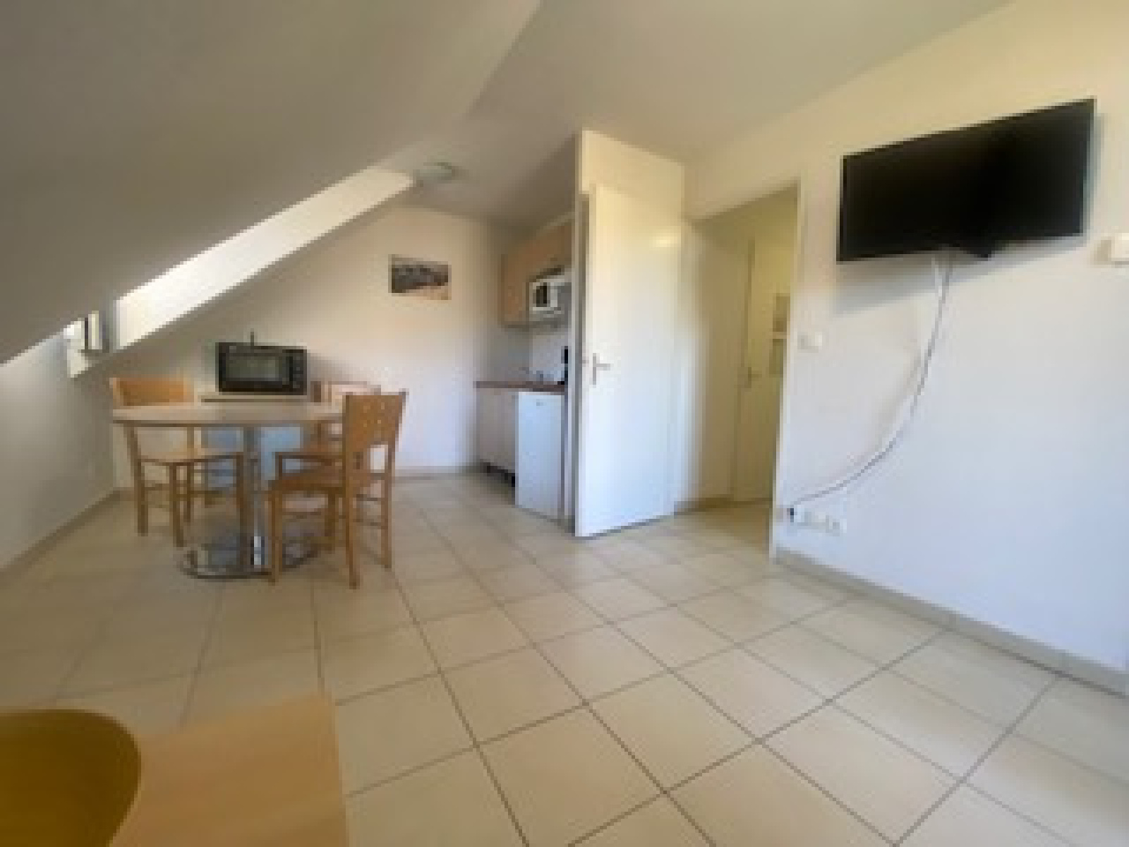 Il présente une entrée ~4,5 m² avec placard, un salon/séjour cosy ~13 m² avec kitchenette entièrement équipée, une chambre ~10 m², une salle de bain/ wc . Un balcon de 4,30 m² couvert surplombant le village et avec vue sur les montagnes